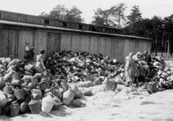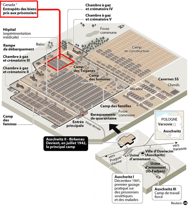 Tous les biens que les déportés ont apportés avec eux à Auschwitz sont saisis par les SS et leurs auxiliaires, les membres du Kommando de triage, l’Aufraumungskommando. Ces biens sont d’abord entreposés dans les entrepôts d’Auschwitz I, au bloc 26, puis à partir de 1943 à Birkenau. Voir le plan ci-dessous.